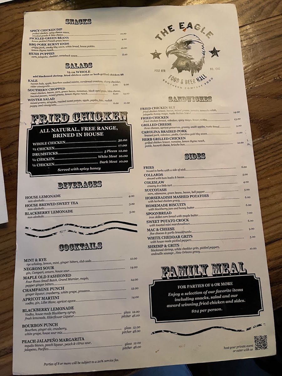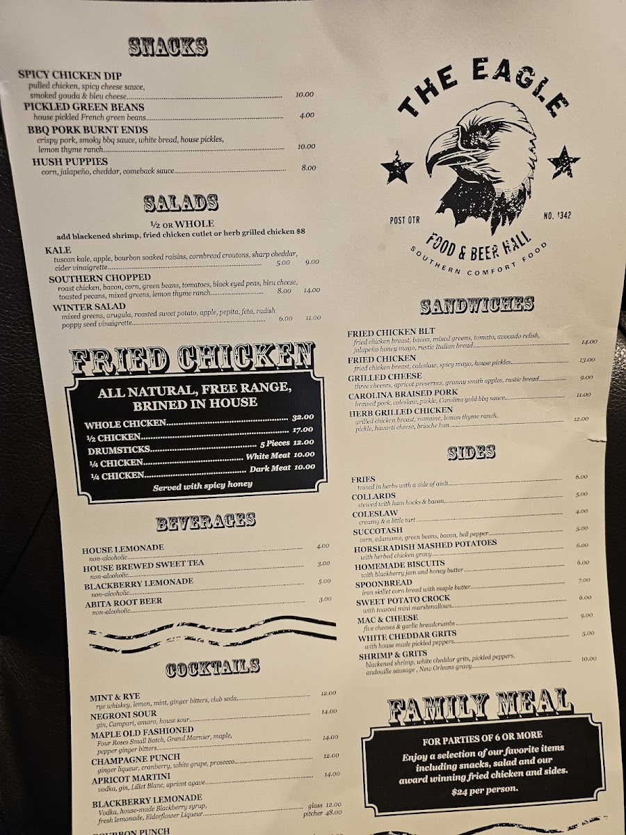 “ What an awesome place! Our server, Logan, was fantastic—genuinely kind and attentive. He truly turned our experience around and saved the day. We were honestly on the verge of leaving due to a rocky start, but thanks to him, we ended up having a wonderful meal. The food was outstanding. The fried chicken was perfectly seasoned, and the hot honey was a standout—sweet, spicy, and absolutely delicious. The mac and cheese was rich and flavorful, and dipping the biscuits into the cheese sauce! WOW! Pure comfort food bliss. The Bourbon Punch cocktail was also a hit—refreshing, well-balanced, and generously sized. Just to give some context: we arrived at The Eagle around 3 PM on a hot and sunny day with our 1.5-month-old granddaughter and a party of six. We asked the host to seat us at a specific outdoor table that was shaded, but the initial interaction wasn’t ideal and made us feel unwelcome. Thankfully, our server completely changed the tone of our visit, and we’re so glad we stayed. ”